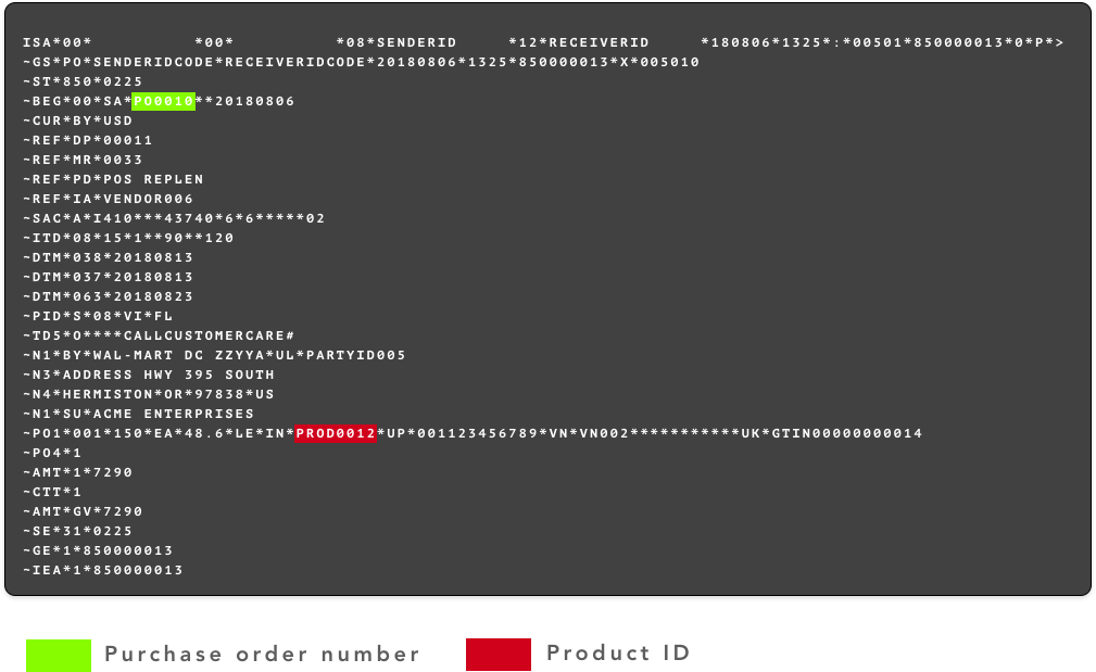 An Electronic Data Interchange is a file that has important data points formatted in a certain way. For example, if you take a Purchase order EDI, it will have the following data points,